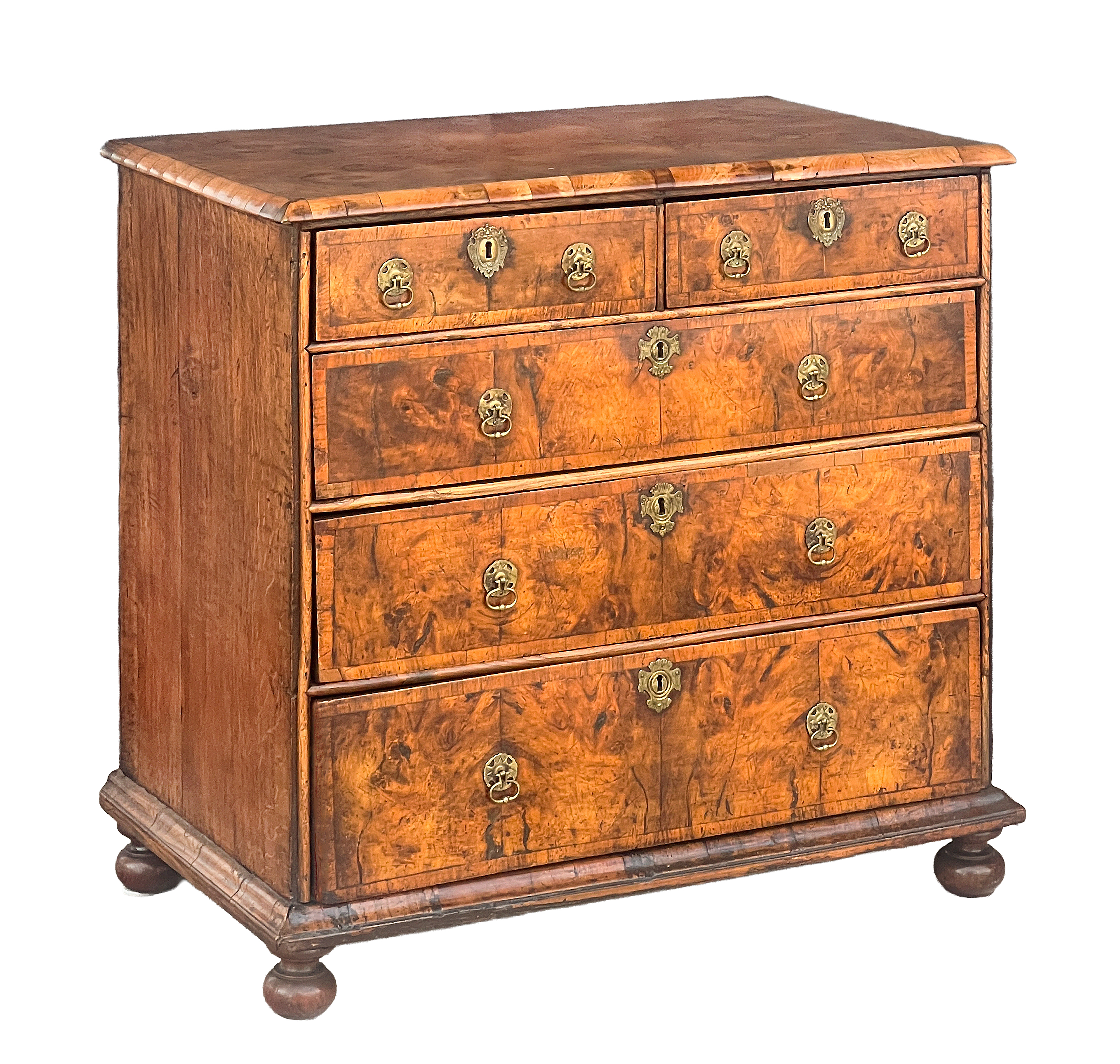 A fine English chest of drawers of walnut and oak from the Queen Anne period, circa 1710, featuring a moulded top of beautiful figured burl walnut, above a frieze of two short drawers and three long, graduated drawers.