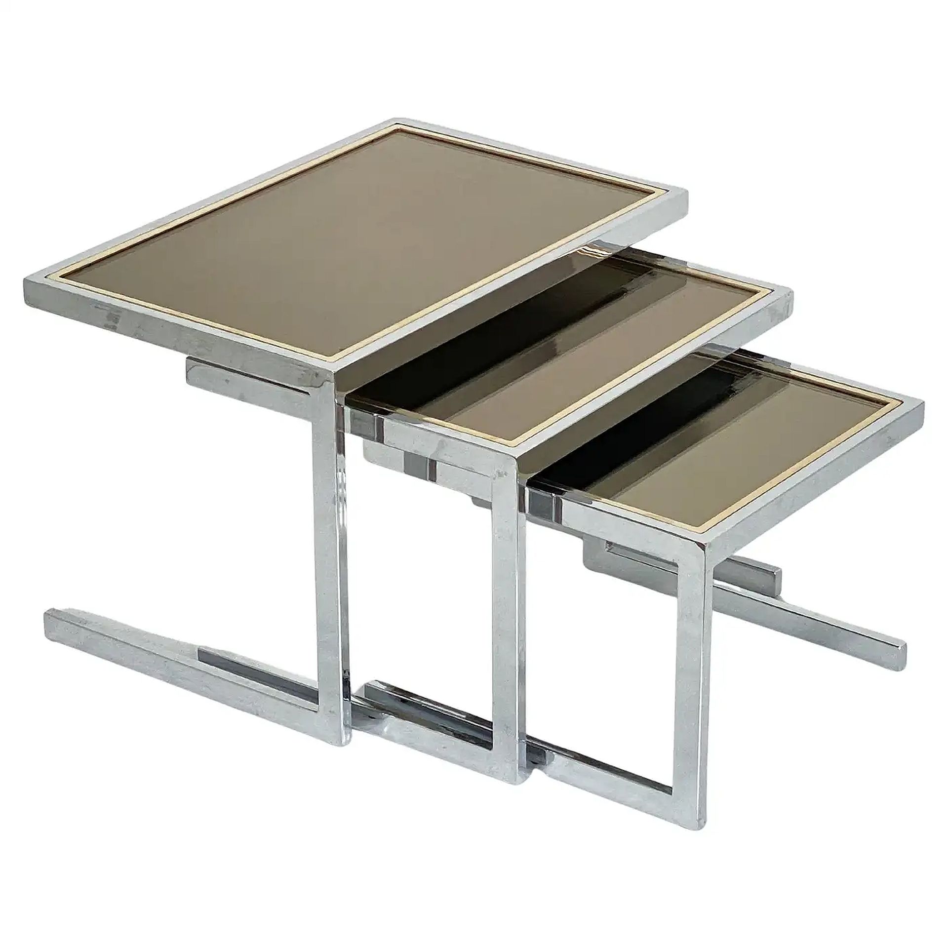 A fine set of three Mid-Century Modern nesting tables from the Hollywood Regency period, attributed to the Belgian design firm, Belgo Chrome - each table featuring a chromed metal frame with gold-toned trim surrounding smoked glass tops.